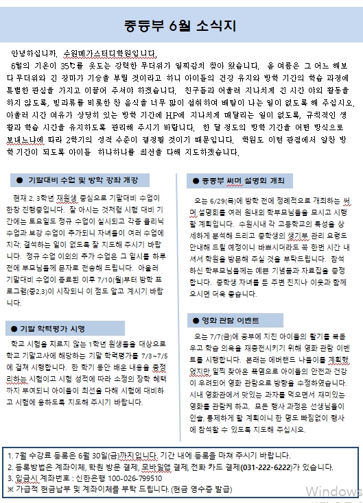 2023년 중등부 6월 소식지(가정통신문) 페이지 정보 작성자 최고관리자 작성일 23-06-20 21:28 조회 3,310회 댓글 0건 본문 * 7월 등록기간입니다. 6월 23일(금) ~ 6월 30일(금)까지입니다.