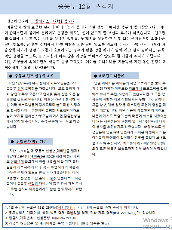 2023년 중등부 12월 소식지(가정통신문) 페이지 정보 작성자 최고관리자 작성일 23-12-23 15:57 조회 3,139회 댓글 0건 본문 * 12월 등록기간입니다. 등록기간은 12월 29일(금)까지입니다.