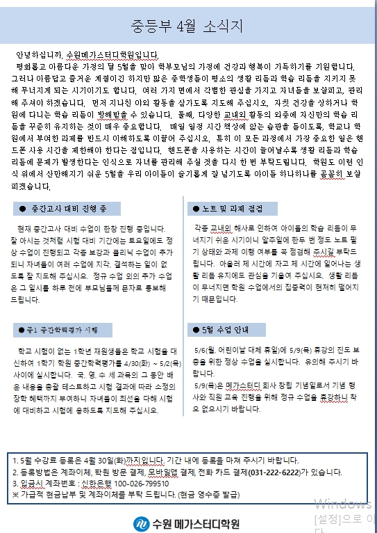 * 중1 중간학력평가 일정: 4/30(화)(~5/2(목)까지 실시합니다. 주요 3과목(국어논술, 영어, 수학 / 3개월 장학혜택 부여)