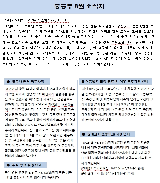 - 영어 학교별 수업: 9/13(화)부터 실시