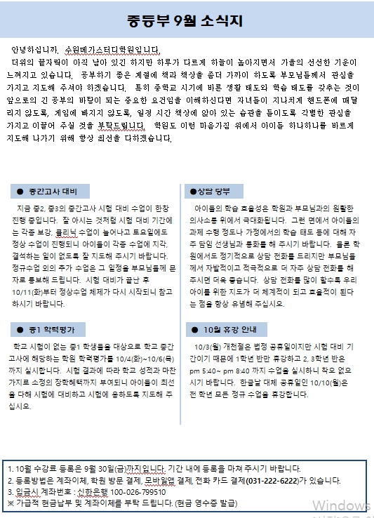 2022년 중등부 9월 소식지(가정통신문) 페이지 정보 작성자 최고관리자 작성일 22-09-20 21:00 조회 3,381회 댓글 0건 본문 * 10월 수강료 등록기간은 10월 30일(금)까지입니다.