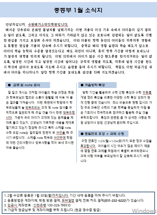 2023년 중등부 1월 소식지(가정통신문) 페이지 정보 작성자 최고관리자 작성일 23-01-20 21:25 조회 3,308회 댓글 0건 본문 * 1월 등록기간은 1월 30일까지입니다.
