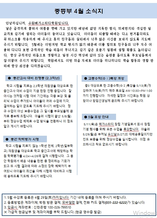 * 다음주 4월 24일 ~ 26일 사이 1학년 전체 학원 중간 학력평가가 시행됩니다.
