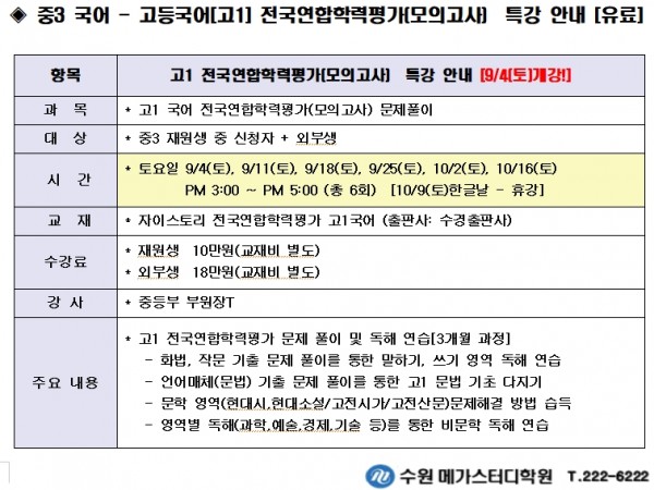 2021년 중등부 9월 고1 국어 모의고사 특강 안내 페이지 정보 작성자 최고관리자 작성일 21-08-18 20:33 조회 3,391회 댓글 0건 본문 * 고1 전국연합학력평가(모의고사) 특강 9월 개강일 : 9/4(토) 부터 5주간입니다.