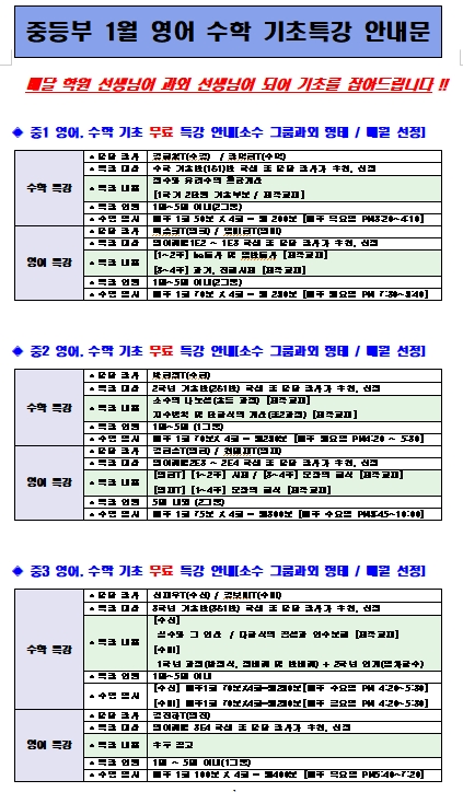 2022년 중등부 1월 영어,수학 기초무료특강 안내문
