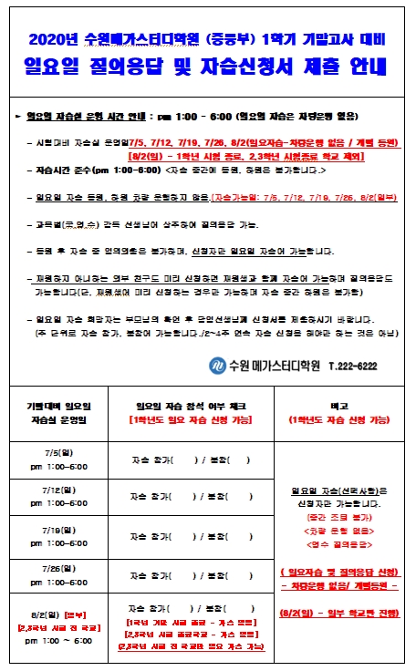 * 일요자습은 신청자만 가능하며 국영수 과목별 선생님의 1:1 개별 질의 응답이 진행됩니다.