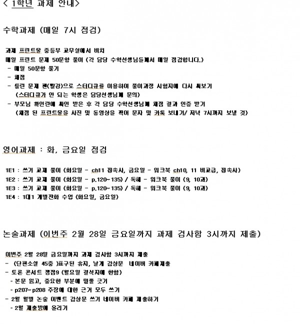 [코로나 과제] 신종코로나19 휴원 관련 1학년 과제 안내