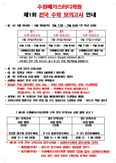 * 제1회 수학 전국 모의고사 접수(신청) : 5/20(수)까지 접수(신청 기간)