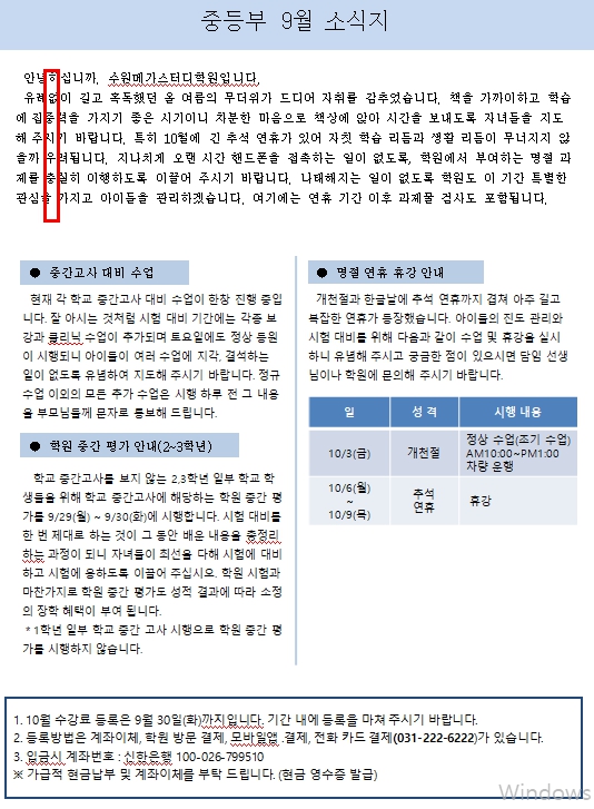 2025년 중등부 9월 소식지(가정통신문) 페이지 정보 작성자 최고관리자 작성일 25-09-19 21:17 조회 617회 댓글 0건 본문 * 10월 등록은 9월 30일(화)까지입니다.