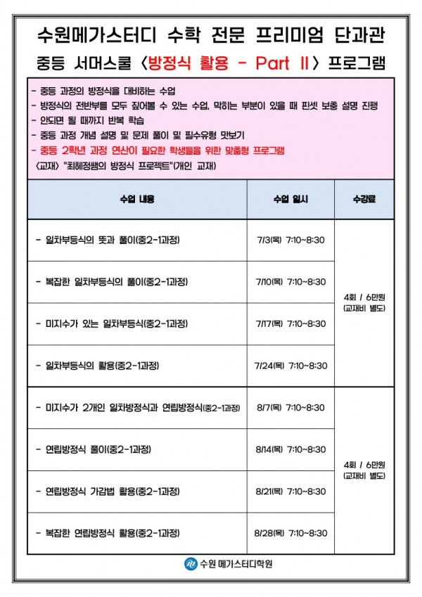 2025 중등부 여름방학 수학 특강(중2-1 방정식 활용 특강) 페이지 정보 작성자 최고관리자 작성일 25-06-19 15:22 조회 602회 댓글 0건 본문 여름방학 중2-1 방정식 활용 특강 안내