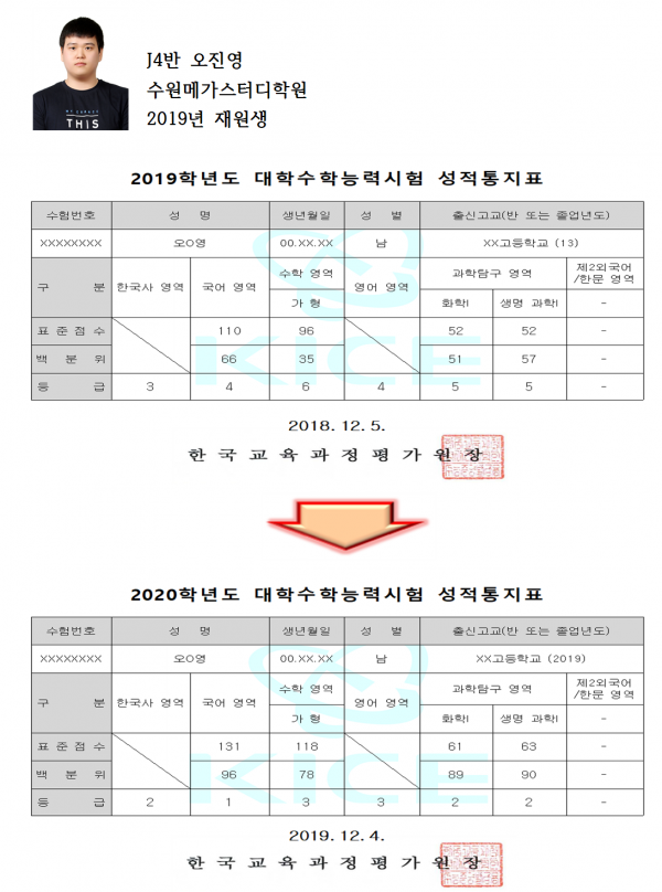 처음에는 성적이 오르는 것이 눈에 보이지 않아 포기할까라고 생각을 했습니다. 그러나 그럴 때 마다 담임 선생님께서 꾸준히 하다 보면 언젠가는 보상이 돌아올 것이다 라며 계속해서 격려를 해주셨습니다. 담임 선생님이 아니었다면 저는 지금 재수를 포기하고 군대에 가 있었을 겁니다. 또한 수원 메가스터디만의 뛰어난 선생님들의 강의로 성적이 많이 향상 되었습니다. 그 결과 총 14등급 상승이라는 결과를 얻게 될 수 있었습니다.