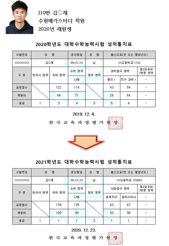 제가 수원메가스터디학원에서 재수를 성공적으로 마무리할 수 있는 가장 큰 이유는 선생님들의 수업 방향을 최대한 따라가려고 노력했기 때문이라고 생각합니다. 재수생 여러분들도 선생님들의 수업 방향을 믿고 최대한 따라가려고 노력한다면 충분히 저처럼 성공적인 재수 결과를 성취할 수 있다고 생각합니다. 올 한해 열심히 노력하셔서 다들 원하는 대학에 합격하시길 바라겠습니다.
