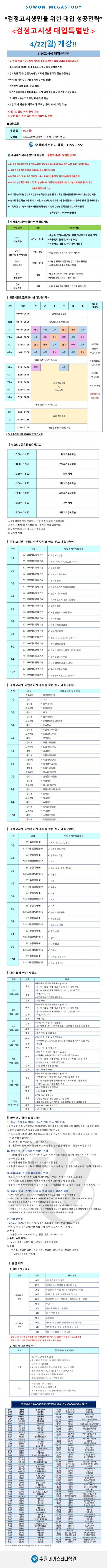 재수 검정고시생 대입특별반 개강 안내 페이지 정보 작성자 최고관리자 작성일 24-04-03 11:47 조회 2,445회 댓글 0건 본문 - 개강 인원에 미달하면 개설이 안 될 수 있습니다. - 7월 2학기에는 기존 종합반으로 편입됩니다.
