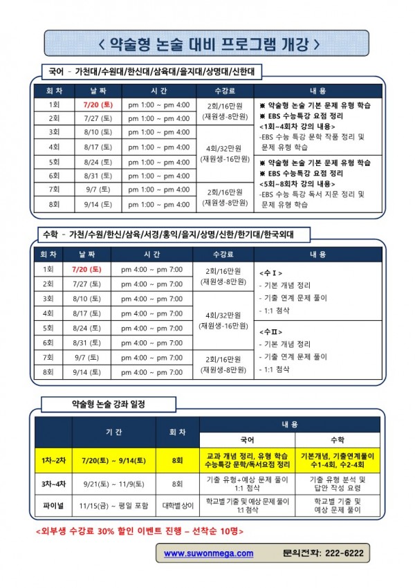 공지 2025 대입 약술형 논술 대비반 개강 이벤트 진행 페이지 정보 작성자 최고관리자 작성일 24-06-18 15:53 조회 2,223회 댓글 0건 본문 2025 대입 약술형 논술 대비반 개강 - 외부생 등록 시 단과 수강료 30% 할인 혜택