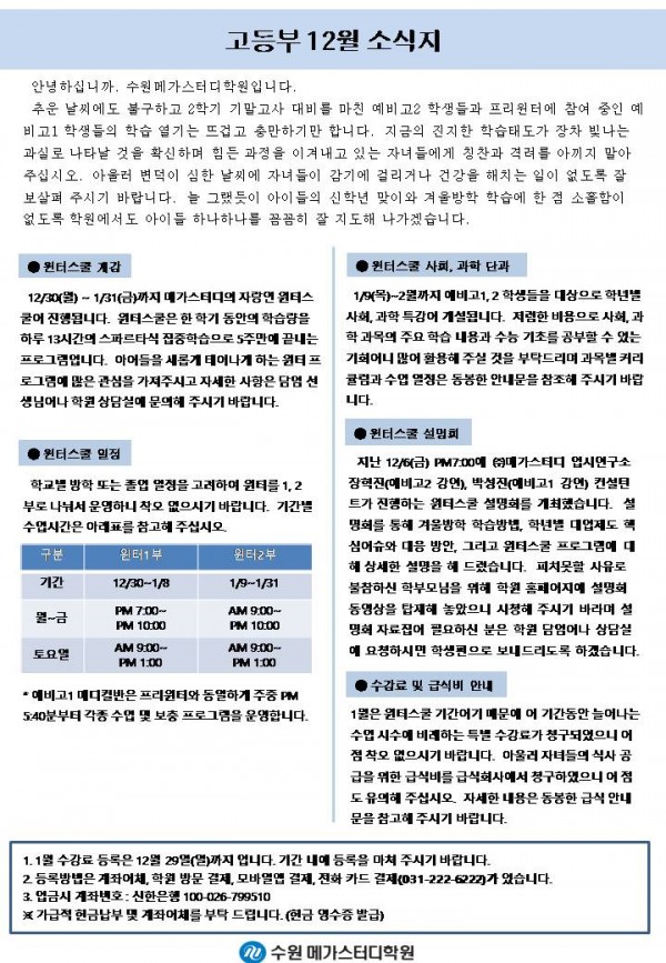 고등 [예비고1,2] 12월 가정통신문