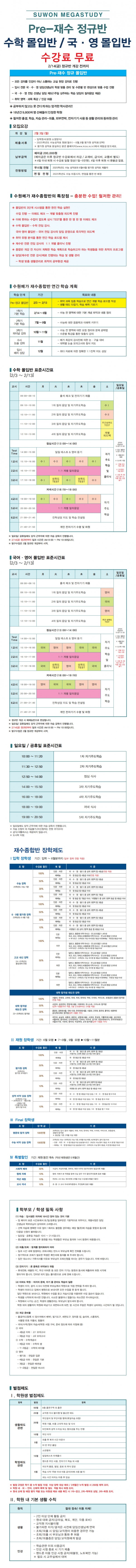 재수 2026 pre-재수 종합 수학 몰입반 / 국어·영어 몰입반 개강 안내 페이지 정보 작성자 최고관리자 작성일 25-01-14 17:06 조회 1,730회 댓글 0건 본문 2026 pre-재수 종합 수학 몰입반 / 국어·영어 몰입반 개강 안내