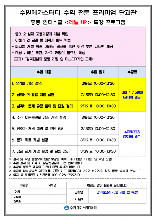공지 중등 윈터스쿨 <레벨 업> 프로그램 안내 페이지 정보 작성자 최고관리자 작성일 25-01-31 10:58 조회 1,552회 댓글 0건 본문 중등 윈터스쿨 <레벨 업> 프로그램 안내