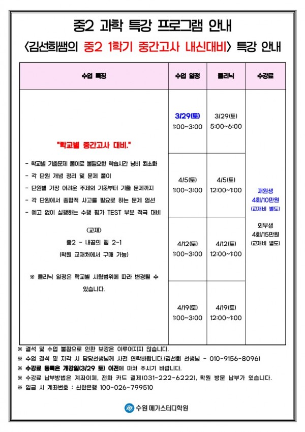 중등 중등 과학 중간고사 대비 프로그램 개강 페이지 정보 작성자 최고관리자 작성일 25-03-20 15:36 조회 1,111회 댓글 0건 본문 중등 과학 중간고사 대비 프로그램 개강