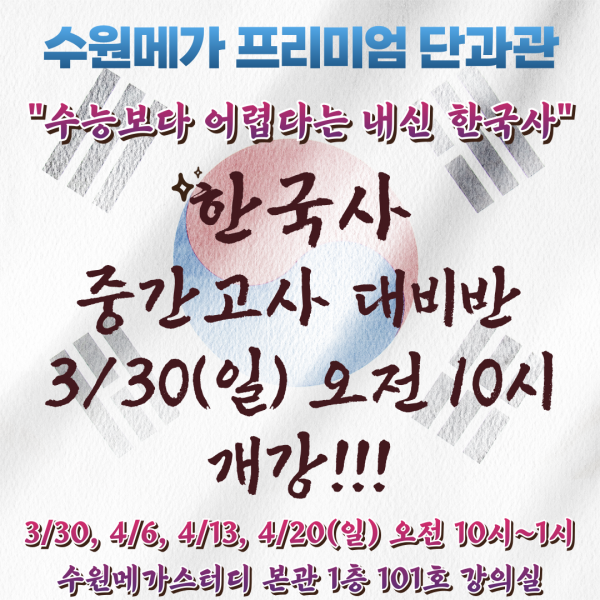 공지 고등 한국사 중간고사 대비 프로그램 개강 페이지 정보 작성자 최고관리자 작성일 25-03-21 11:10 조회 1,074회 댓글 0건 본문 4주 동안 진행되는 단기 한국사 내신대비 단과 프로그램 <메가스터디 본원 강사 직강>