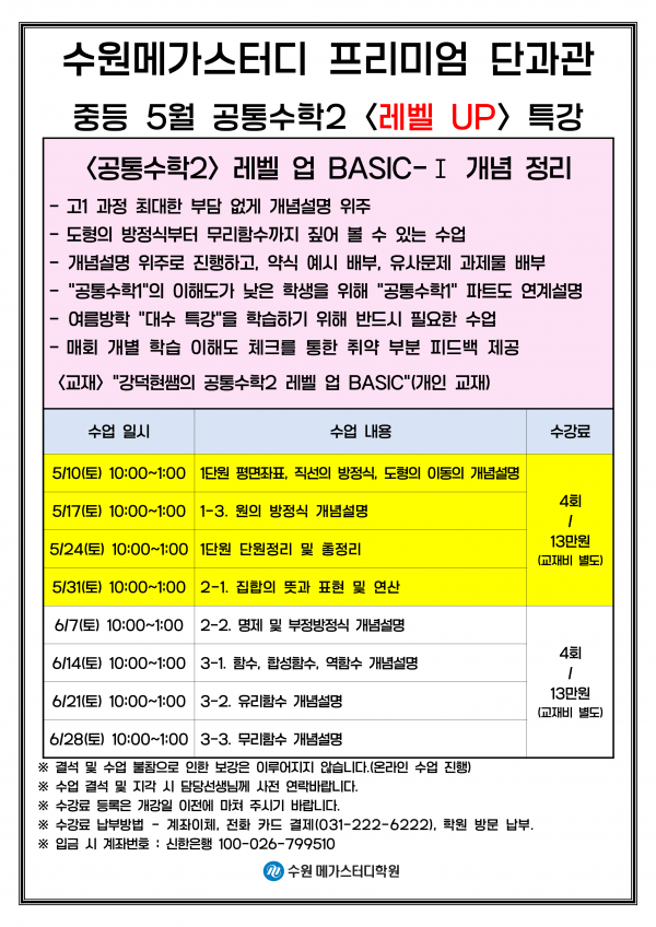 중등 중등부 <공통수학2> 레벨 업 개념정리반 개강 안내 페이지 정보 작성자 최고관리자 작성일 25-04-11 16:31 조회 1,101회 댓글 0건 본문 중등부 <공통수학2> 레벨 업 개념정리반 개강