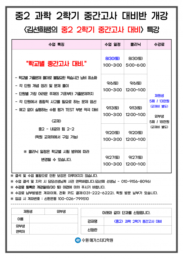 중등 중등 과학 2학기 중간고사 대비 프로그램 개강 페이지 정보 작성자 최고관리자 작성일 25-08-07 12:07 조회 675회 댓글 0건 본문 중등 과학 2학기 중간고사 대비 프로그램 개강
