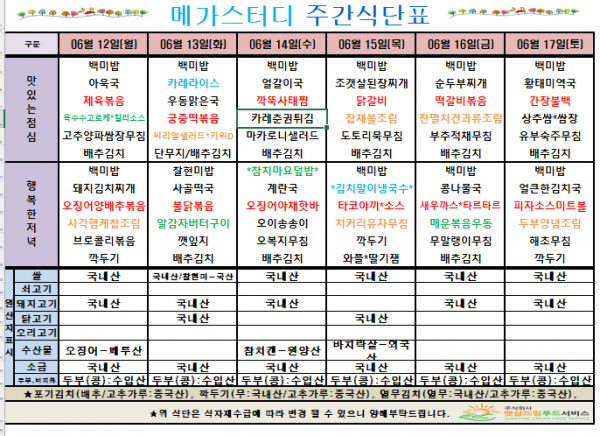 6월 2주차 식단표(6/12~6/17)