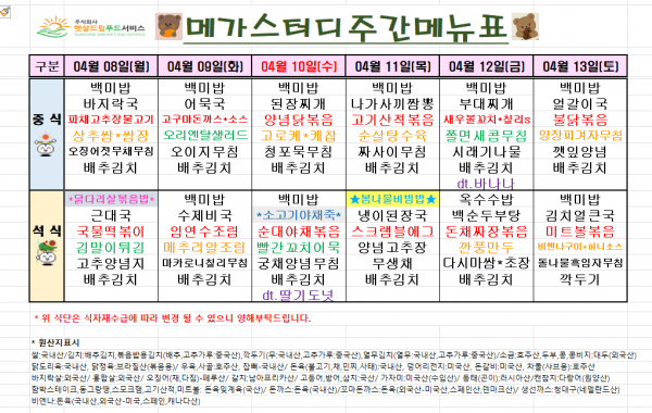 4월 2주차 식단표(4/8~4/13)