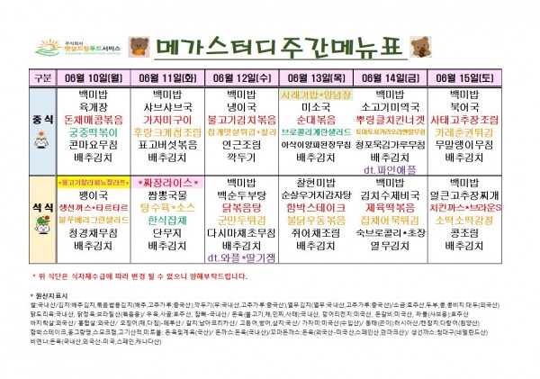 6월 2주차 식단표(6/10~6/15)