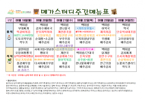 8월 3주차 식단표(8/19~8/24)