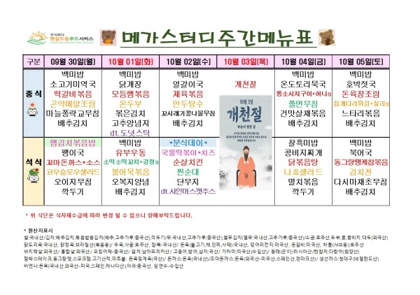 10월 1주차 식단표 (9/30~10/5)