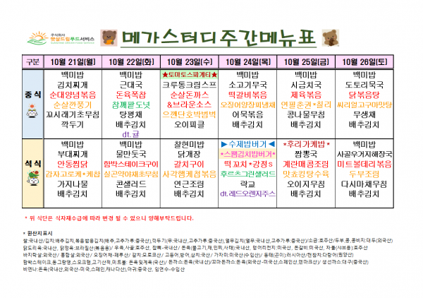 10월 4주차 식단표(10/21~10/26)