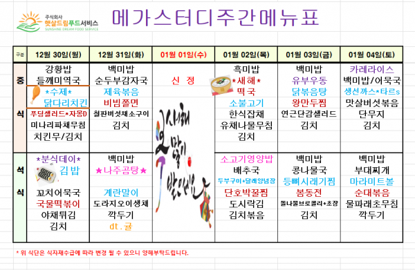 12월 5주차 식단표(12/30~1/4)