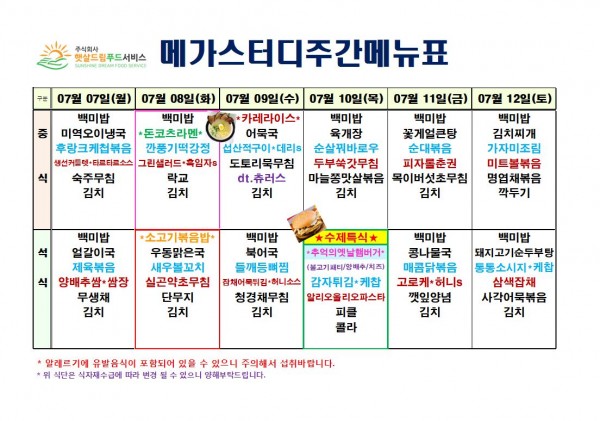 7월 2주차 식단표(7/7~7/12)