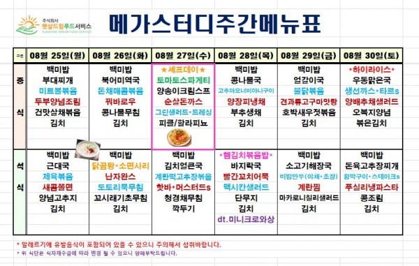 8월 4주차 식단표(8/25~8/30)